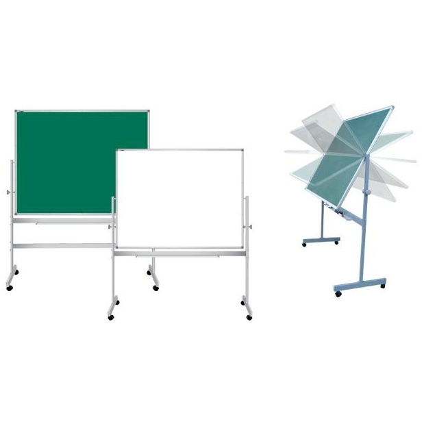 Передвижная поворотная доска установлена на металлической стойке, позволяющей ей поворачиваться вокруг горизонтальной оси. Две рабочие поверхности — из стального эмалированного листа с антибликовым покрытие. Обрамление доски — высокопрочный алюминиевый профиль, благодаря чему имеет высокую износоустойчивость и прочность. Положение доски можно зафиксировать под любым углом, благодаря механизму на одной из вертикальных стоек. Вы также можете размещать дополнительные наглядные материалы, плакаты и использовать доску в качестве экрана для проектора. Имеется  лоток для мела/маркеров и принадлежностей.