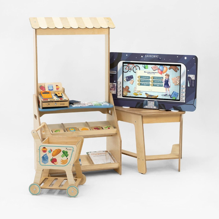 4) Дополнительная атрибутика. Детский киоск "Магазин" с кассой, тележкой и продуктами. Макеты денег и пластиковых карт, копилки, кошельки, наборы для игры в группе на тему уроков.