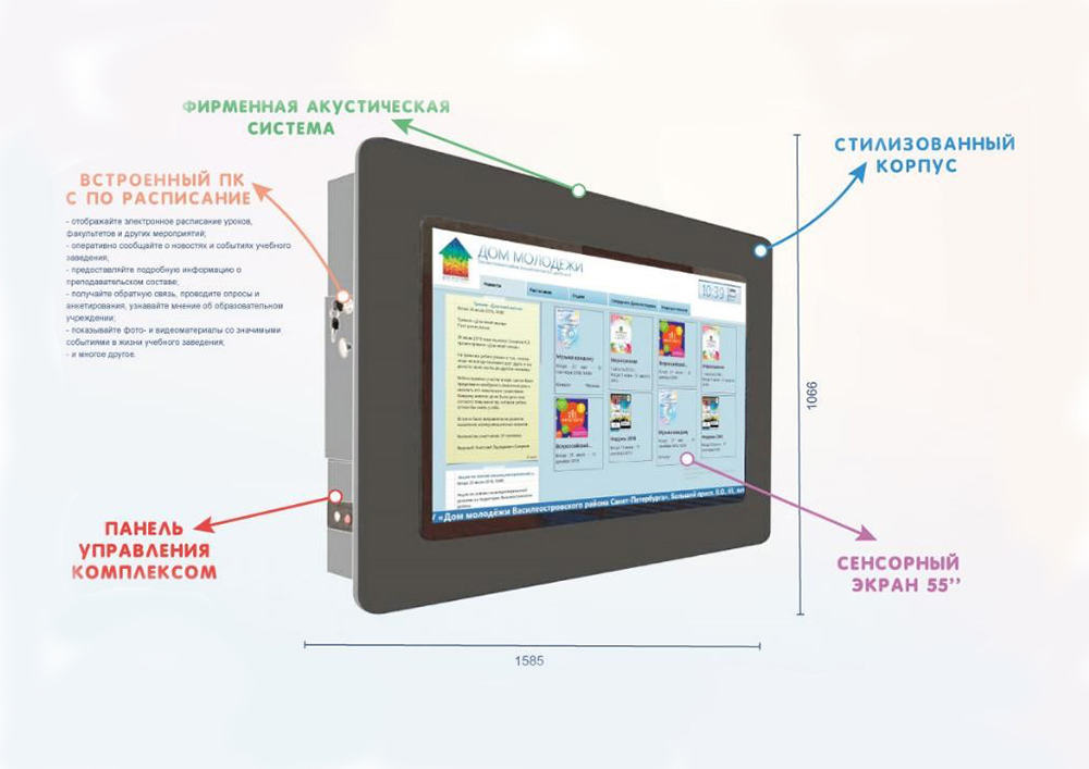 • на интерактивной панели, которая обычно располагается в холлах, вестибюлях, коридорах и рекреациях, полностью отображается необходимая учащимся информация.