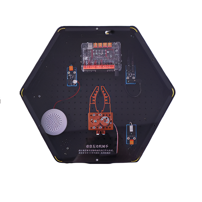 Интерактивный модуль для оформления зон рекреации, кабинетов, IT-полигона, библиотеки, медиа зоны. Модуль позволяет с помощью голосовых команд управлять захватным механизмом манипулятора. Выполнен в форме шестиугольной призмы с интерактивным наполнением.