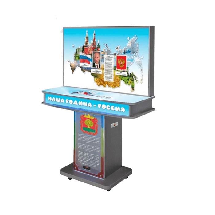 Мультимедийный комплекс гражданско-патриотического воспитания выполнен в виде стойки-монумента, с возможностью стилизации «под заказчика» и расположенной на ней панорамы «Россия».