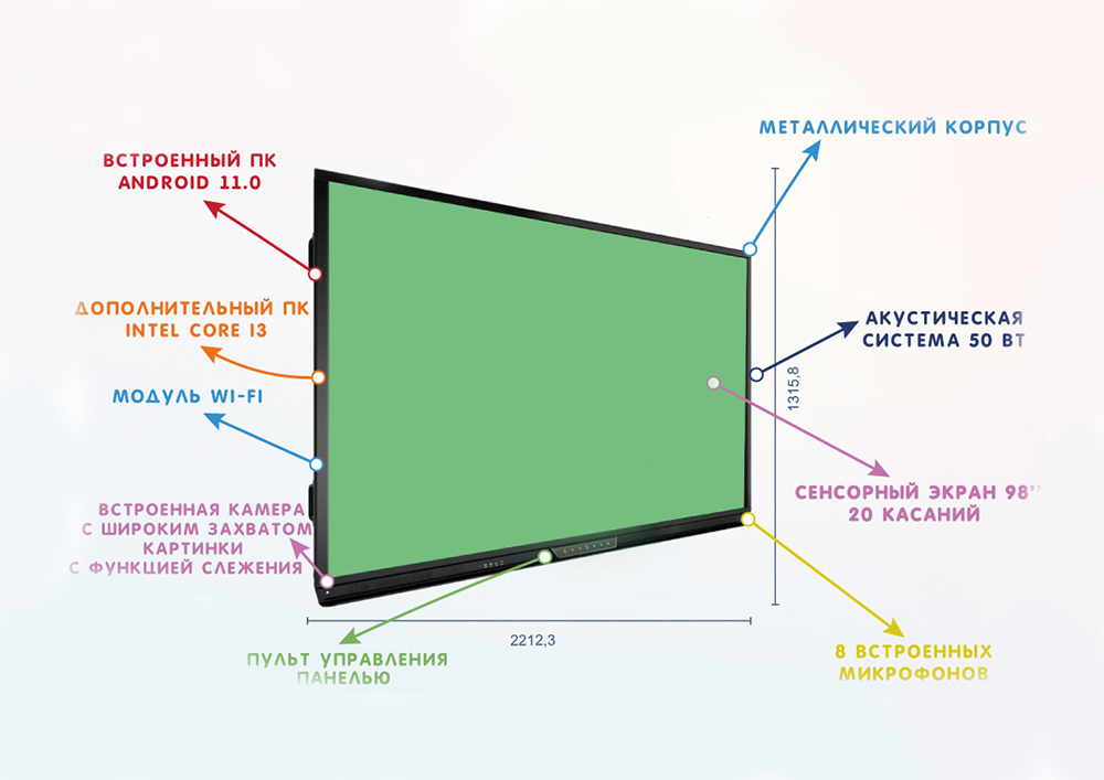 Smart SchoolBoard 98 – это сенсорная панель высокого разрешения в тонкой металлической рамке. Благодаря четкому и яркому изображению все демонстрируемые материалы хорошо видны из каждого уголка класса или аудитории.