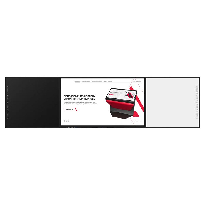 • в его состав входят: центральная сенсорная панель, дополненная двумя дополнительными досками – маркерными или меловыми, расположенными по краям;