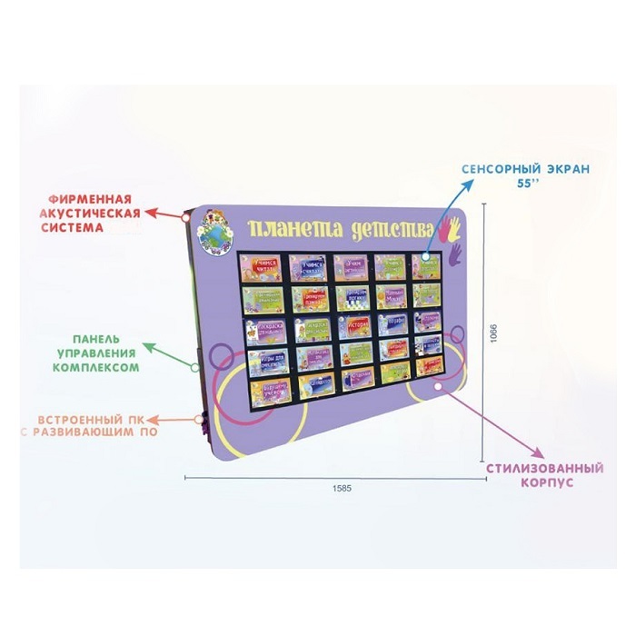 Настенная сенсорная панель «Сенсорик» выполнена в лаконичном дизайне и с увеличенной диагональю антивандального сенсорного монитора 55 дюймов для размещения в групповых комнатах детских садов, рекреациях, начальных школах и детских комнатах ресторанов и ТРЦ.