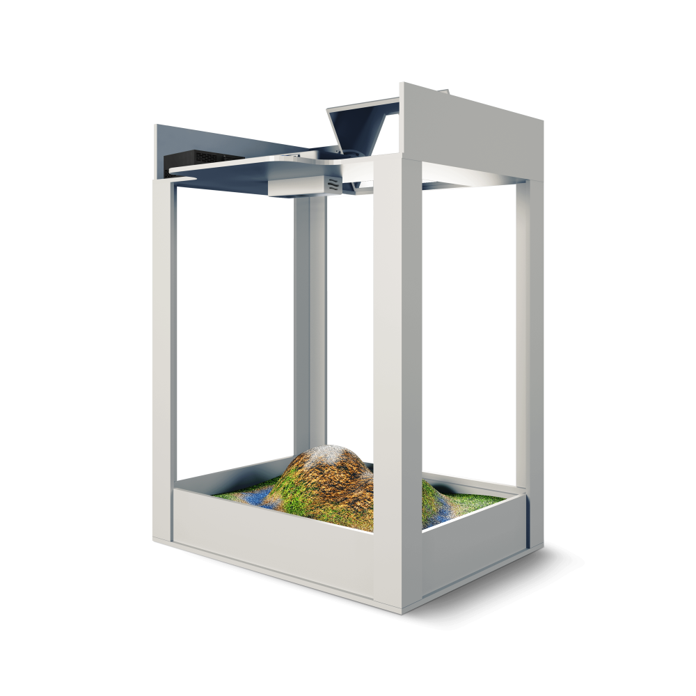 Это развивающий комплекс, который объединяет в себе возможности интерактивной песочницы и сенсорного стола. Технология дополненной реальности превращает обычный песок в земную поверхность с озёрами и горами, вулканами и долинами. Дополнительные панели позволяют проводить занятия в режиме сенсорного стола.