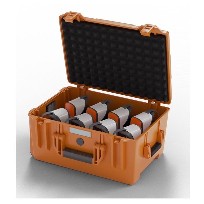 Комплект гарнитур поставляется в мобильном пластиковом кейсе, который обеспечивает не только сохранность оборудования, но и позволяет своевременно и оперативно его заряжать. Кейс оснащён колёсами и выдвижной ручкой для удобного перемещения из кабинета в кабинет.