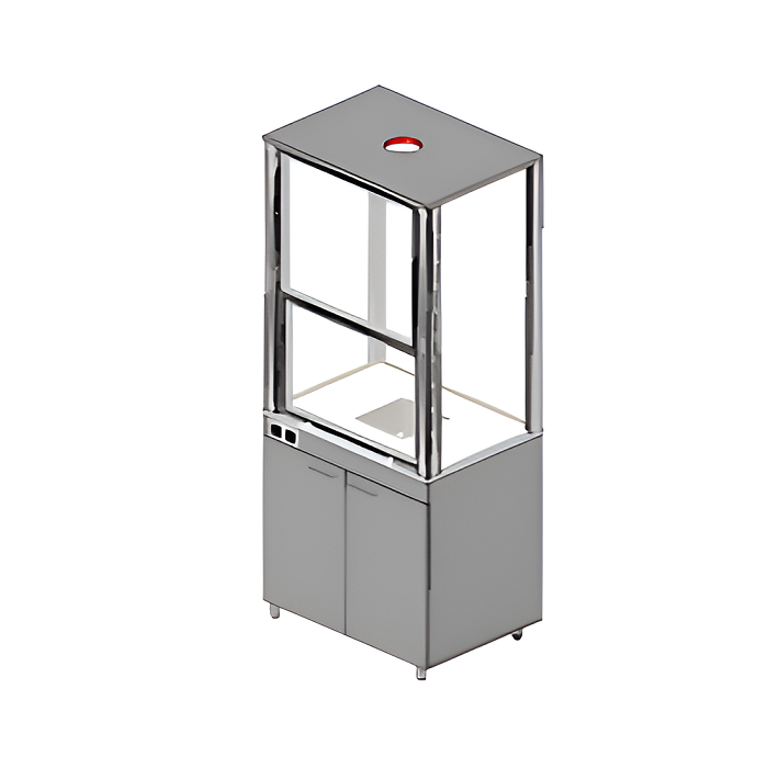 • Верхняя часть шкафа со стеклянными стенками из органического стекла толщиной не менее 3 мм, которые крепятся к металлическому каркасу, имеет в передней части дверь из оргсекла в алюминиевом профиле поднимающуюся вверх при помощи специального механизма.