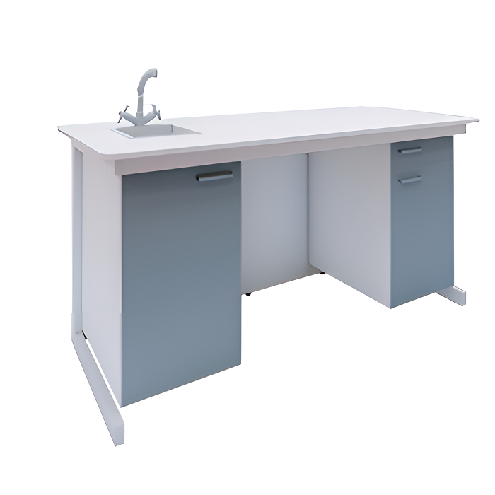 • Столешница стола изготовлена из ЛДСП с покрытием хим. стойким HPL толщиной не более 18 мм. В крайней части стола располагается мойка, изготовленная из Полиуретана, размер мойки не менее 240х140х140 мм..