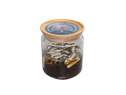 Модель представляет собой стеклянную банку с сигаретными окурками и сигаретной пачкой, залитой липким и вязким составом. Состав имитирует смолу, которая выделяется при выкуривании сигареты.