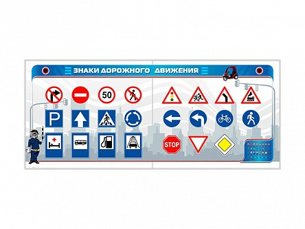 Стенд состоит из 2-х красочных секций, содержащих 23 дорожных знака (Знаки Предупреждающие, Приоритета, Запрещающие, Предписывающие, Особых Предписаний), которые загораются при нажатии клавиши на пульте управления, смонтированным на панно. Весь комплекс примененных решений позволит воспитателю наглядно продемонстрировать основные дорожные знаки и без труда увлечь детей в мир познания дорожной науки.