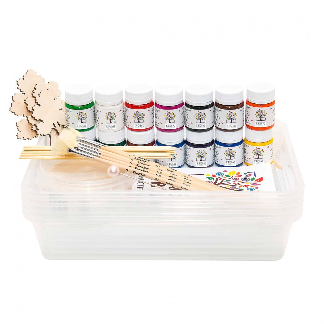1) Краска 20мл. 14 цветов (белый, красный, желтый, синий, зеленый, черный, оранжевый, розовый, коричневый, фиолетовый, голубой, малиновый, салатовый, сиреневый);