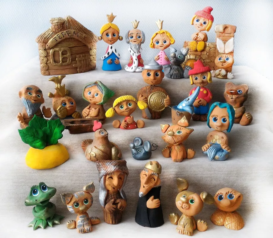 Набор из 27 сказочных персонажей и предметов для составления русских сказок, выполненных из глины: Колобок, Теремок, Курочка Ряба, Репка, Золотая рыбка, По щучьему веленью и др. В наборе фигурки: Теремок, Репка, Бабка, Дед, Внучка, Жучка, Кошка, Мышка, Курочка Ряба, Волк, Медведь, Лиса, Заяц, Лягушка, Колобок, Золотая рыбка, Корыто, Баба Яга, Емеля, Щука, Емеля на печи, Кощей Бессмертный, Водяной, Богатырь, Царь, Царица, Принцесса.