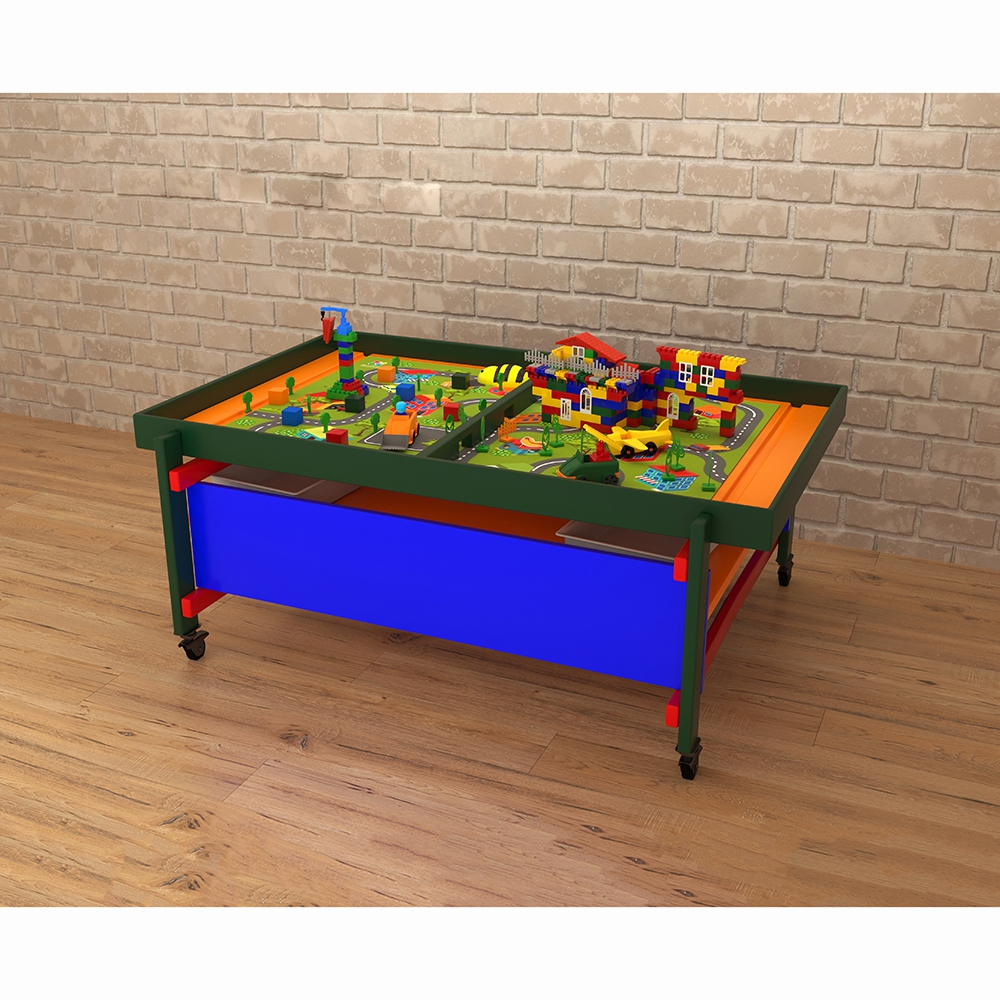 Столешница обладает широким игровым потенциалом – используя методические рекомендации и разнообразнве игровые наборы, можно многократно увеличить диапазон её использования. Расположенные на поверхности стола локации помогут формированию у детей картины мира и отдельных его составляющих. Локации ограничены друг от друга бортиками, это позволяет расположить одновременно на одном столе 2 совершенно разные развивающие игры. В полках стола можно хранить развивающие материалы, предназначенные для развития разнообразных навыков у детей.