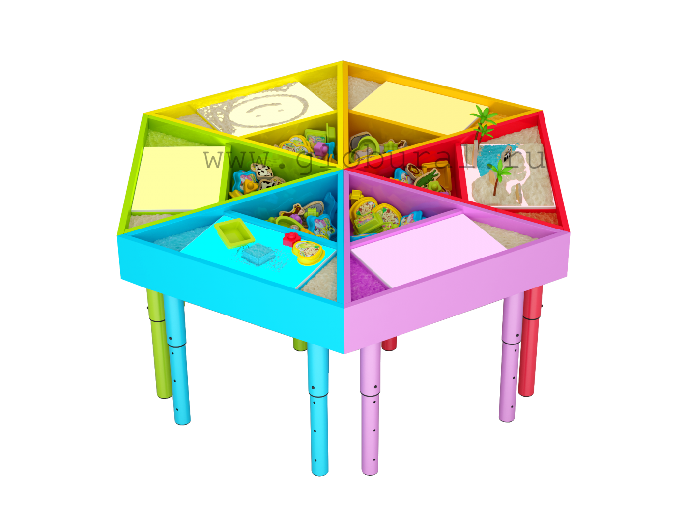 Столы имеют световой планшет для рисования песком, а так же, три отсека: