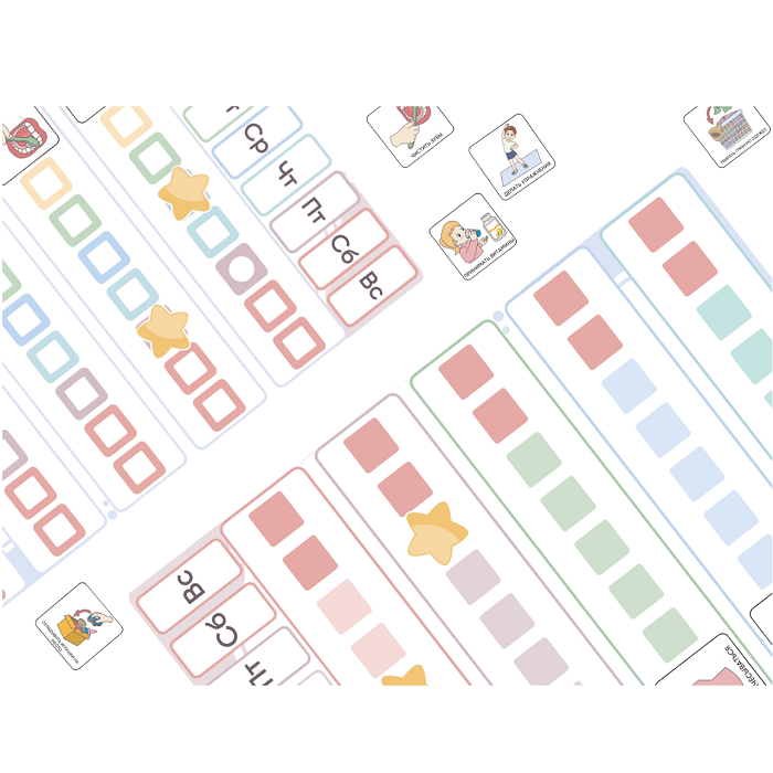 Пособие для организации обучения ребенка ежедневным рутинам: чистить зубы, собирать игрушки, собирать портфель и другие. Помогает фиксировать успешность формирования новой привычки и поддерживает мотивацию ребенка. Карточки для мальчика и для девочки.