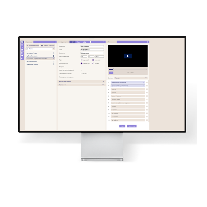 - Программное обеспечение позволяет создавать базу данных, в которой сохраняются индивидуальные настройки, результаты калибровок и игр.