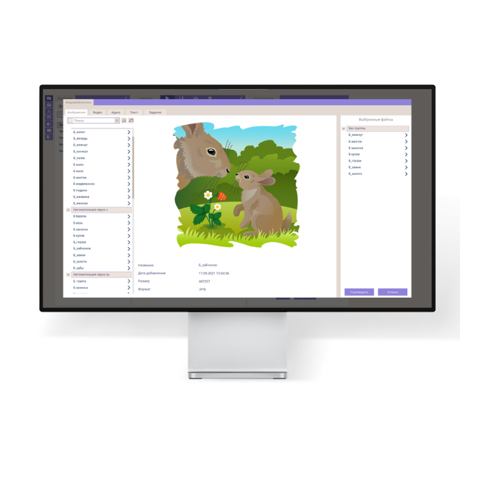 - Специалист может пополнять библиотеку программы, загружая свои изображения/видео/аудио/тексты.