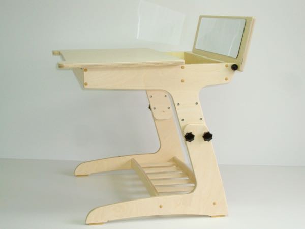 Одноместная парта с откидной столешницей и регулируемым, поднимающимся зеркалом (небьющимся), предназначена для занятий ребенка с логопедом или для самостоятельных занятий.