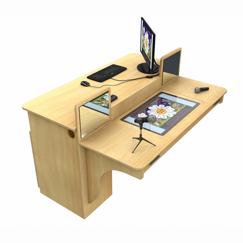 • Рабочее место для двух учеников. Оснащается 2-мя радиомикрофонами, встроенной интерактивной системой, 2-мя зеркалами для отработки логопедических упражнений. Также в модуле предусмотрен монитор диагональю 25”, который оснащен 2-мя механизмами с газовыми пружинами и гидравлическими амортизаторами и может поднимать или опускаться в зависимости от потребности в его использовании.