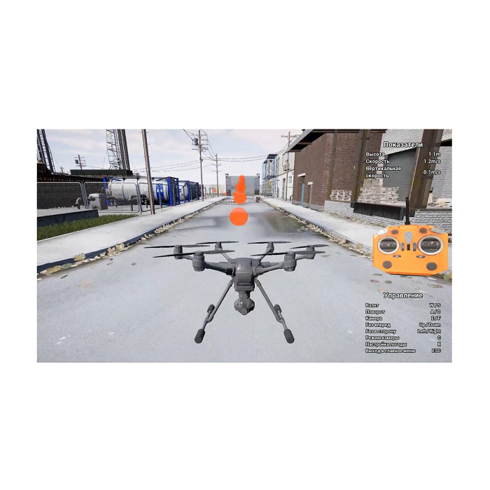 ПО включает 8 уроков. Предназначено для прохождения подготовки оператора БПЛА в разных погодных условиях. Включает 4 основных режима работы: сборка дрона, выполнение полётных заданий с подсказками, выполнение полётных заданий без подсказок, свободный полёт. Доступны тренировки на квадрокоптере, гексакоптере и БПЛА самолётного типа.