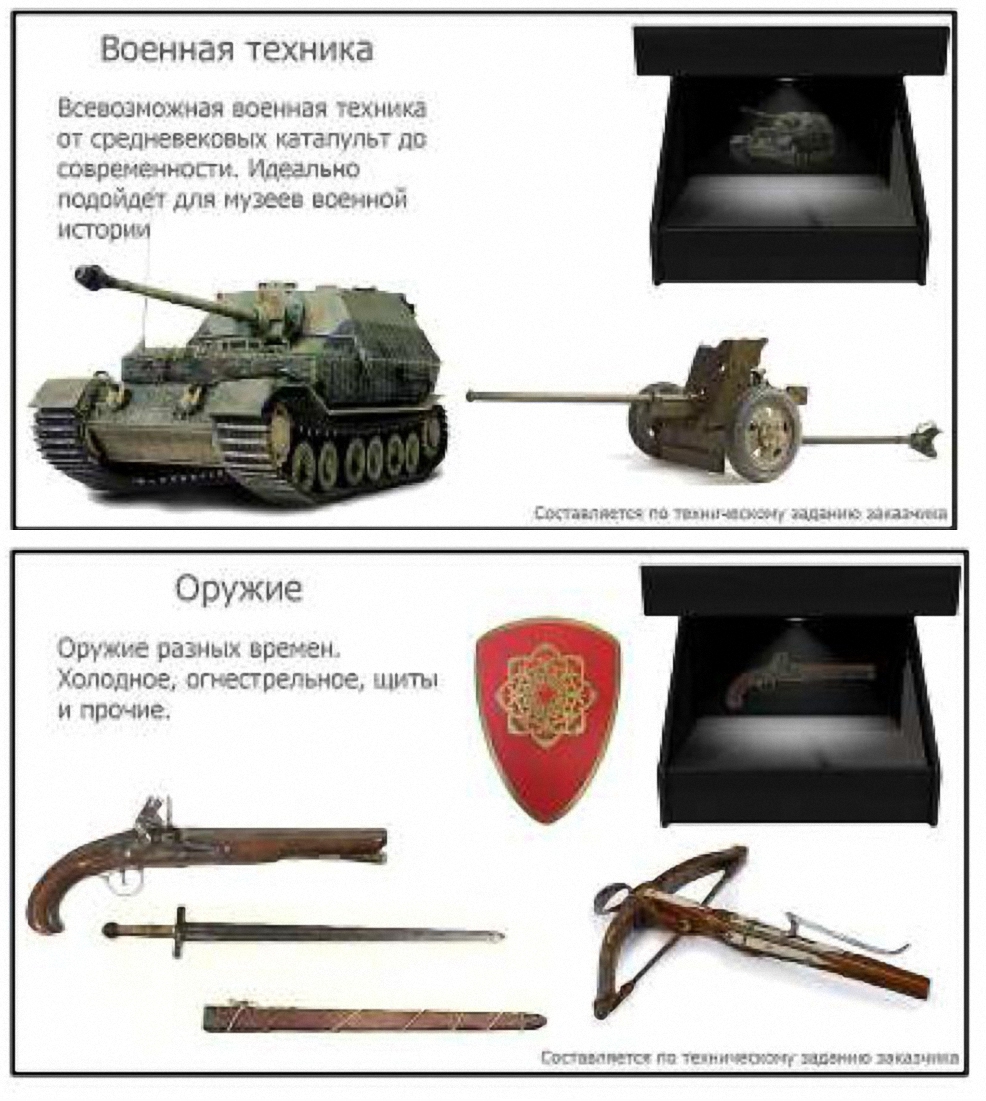 В качестве объектов для демонстрации могут выступать совершенно разные экспонаты: оружие, автомобили, украшение, животные, техника, логотип организации, скульптуры и рекламные видеоролики. Качество изображения Full HD. По желанию, презентация сопровождается текстовой или звуковой информацией.