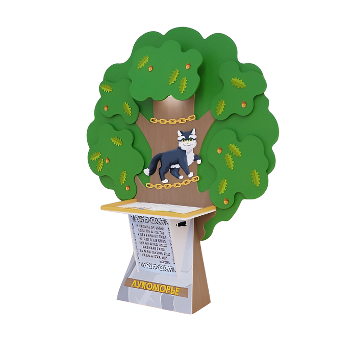 Стойка сконструирована из экологичных и гипоаллергенных материалов, гарантирует безопасность и долговечность даже в условиях интенсивного использования. Дизайн стойки выполнен в узнаваемом виде сказочного дуба, вокруг которого по цепи ходит кот. Дополнен цитатой из поэмы «Руслан и Людмила» А.С. Пушкина «У лукоморья дуб зеленый...».
