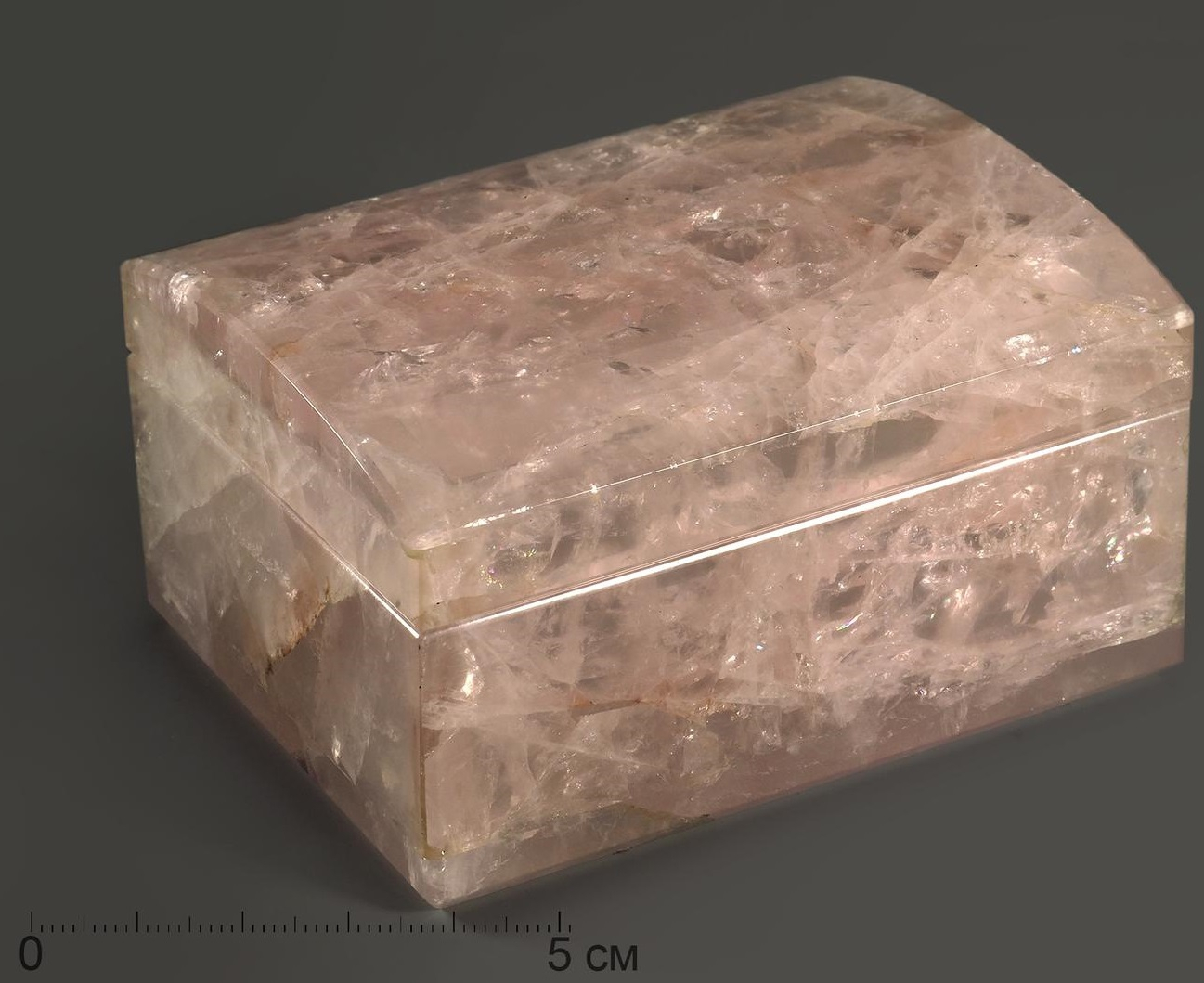 Полированная шкатулка из розового кварца с откидной крышкой.