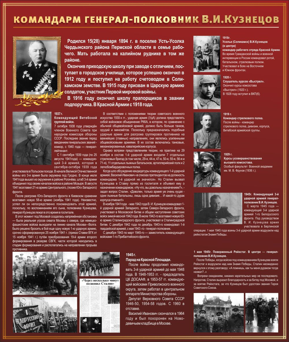 Главная Каталог Оборудование для школьного музея Оборудование для музея истории Тематический исторический стенд "Командарм генерал-полковник ВИ Кузнецов"