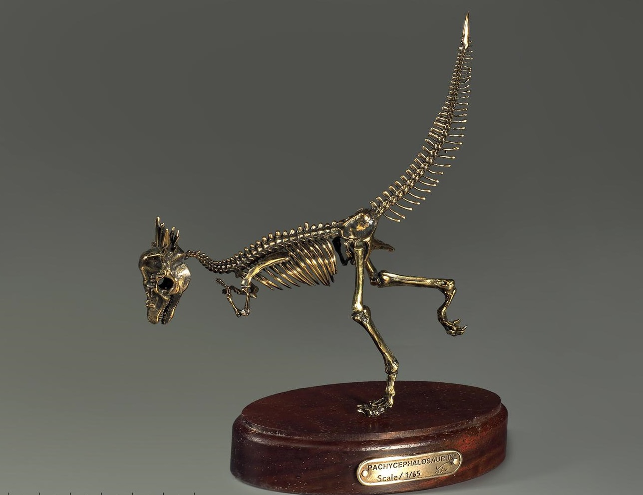Бронзовая модель скелета динозавра Pachycephalosaurus является точной копией оригинального скелета (масштаб: 1/65) и продается в деревянном подарочном ларце с бархатной подкладкой.