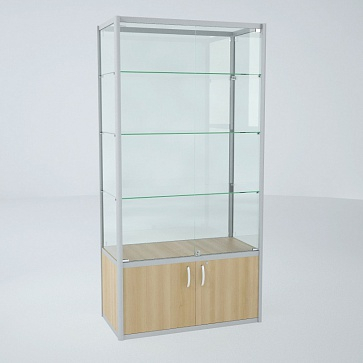 В комплект витрины входит три стеклянные полки, задняя стенка стекло, замки на дверках. Возможно, заменить заднюю стенку на двп или зеркало. Верхняя часть (крыша) стекло без подсветки.