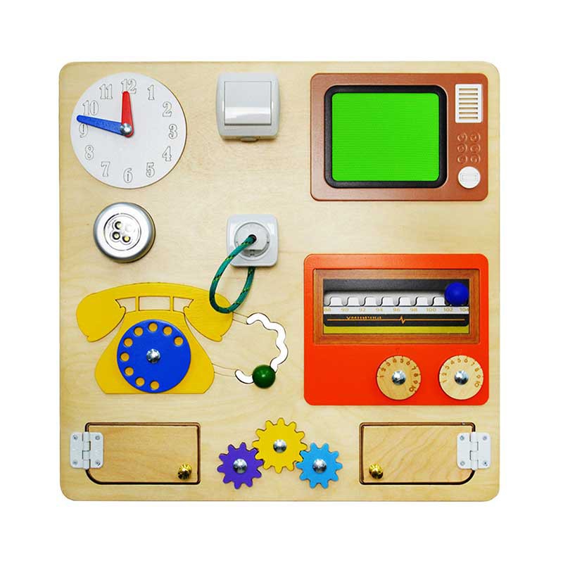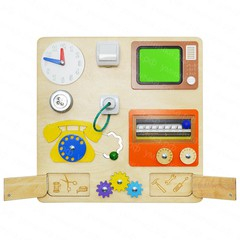 Бизиборд с изображением гостиной с телевизором, радиоприемником, часами и телефоном из серии «Домашние хлопоты». Развивает мелкую моторику, логическое мышление и бытовые навыки. Подходит для детей от 3-х лет и коррекционных занятий по индивидуальным маршрутам для детей с ОВЗ.