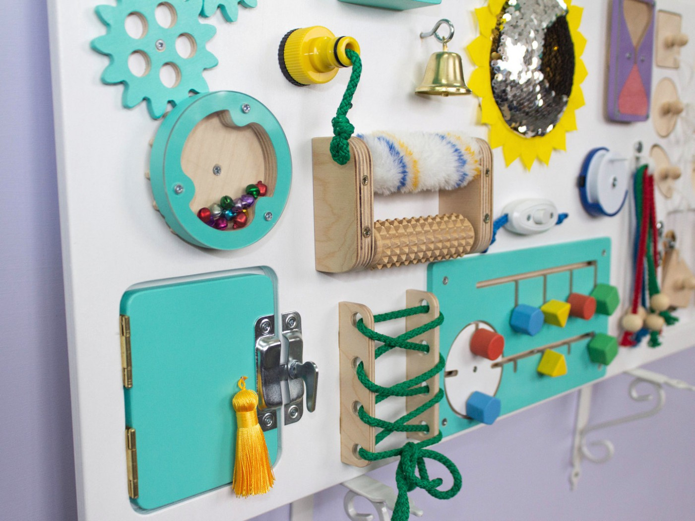 Бизиборд полностью покрашен, что позволяет делать качественную влажную уборку, исключает возможность заноз. Игрушка будет радовать вас своей красотой много лет.