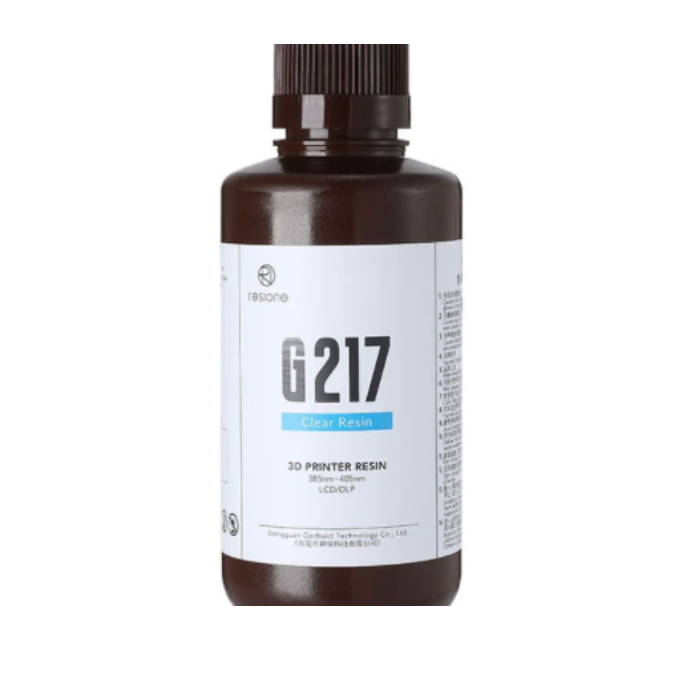Фотополимер Resione g217 прочный и жёсткий с повышенной прозрачностью. Этот фотополимер может использоваться непосредственно для печати, так и в качестве основы для создания полупрозрачных оттенков с помощью красителей.