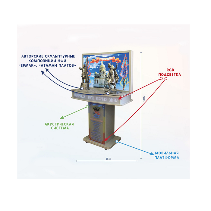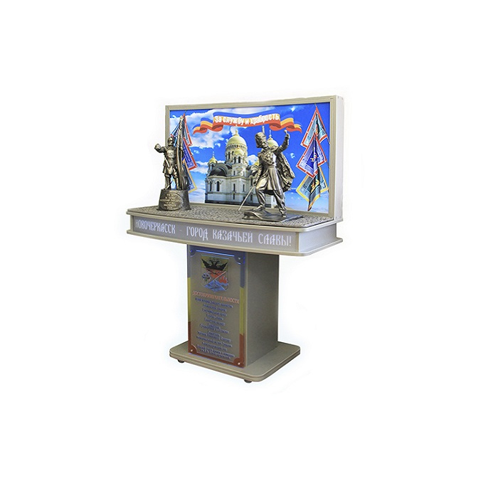 Мультимедийный комплекс гражданско-патриотического воспитания выполнен в виде стойки-монумента «Достопримечательности» с расположенной на ней панорамы. Дополняют панораму с патриотической тематикой скульптуры «Атаман Платов» и «Ермак», выполненные из искусственного камня.