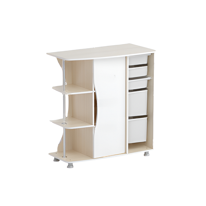 Стеллаж левый Робик 001 выполнен из ламинированной ДСП 16 мм, края обрамлены кантом ПВХ 2 мм. Стеллаж пространственно разделён на три вертикальных секции.
