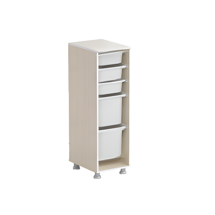 Стеллаж с лотками Робик 001 выполнен из ламинированной ДСП 16 мм, края обрамлены кантом ПВХ 2 мм. Внутреннее пространство стеллажа открыто.