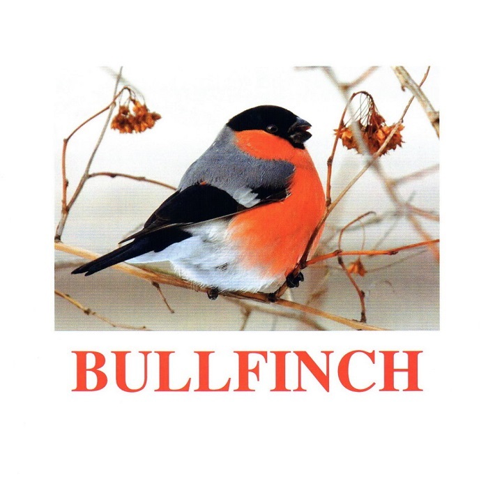 Перевод (на карточках перевод не указывается): Орёл, пеликан, фламинго, утка, журавль, ара, лебедь, колибри, синица, павлин, чайка, сова, кардинал, воробей, голубь, снегирь, скворец, грач, аист, клёст.