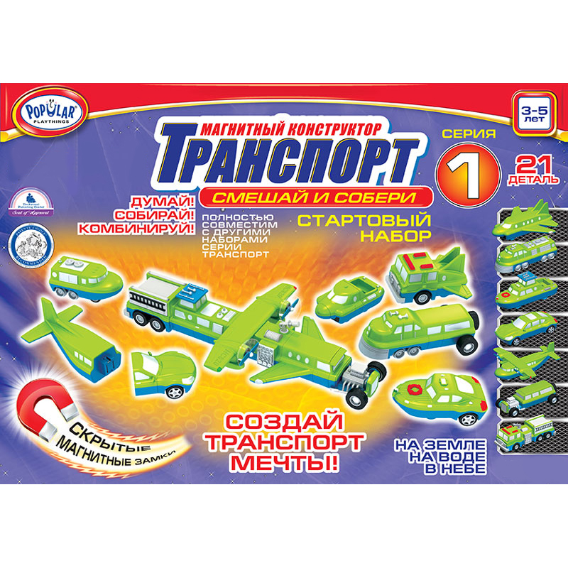 Магнитный конструктор Транспорт "Смешай и собери" серия 1 (стартовый) - это большой набор позволяющий собрать множество различных транспортных средств из 7 базовых моделей (самолет, электровоз, катер, автомобиль, гидросамолёт, скоростной автомобиль, пожарная машина) общее количество деталей которых более 20.