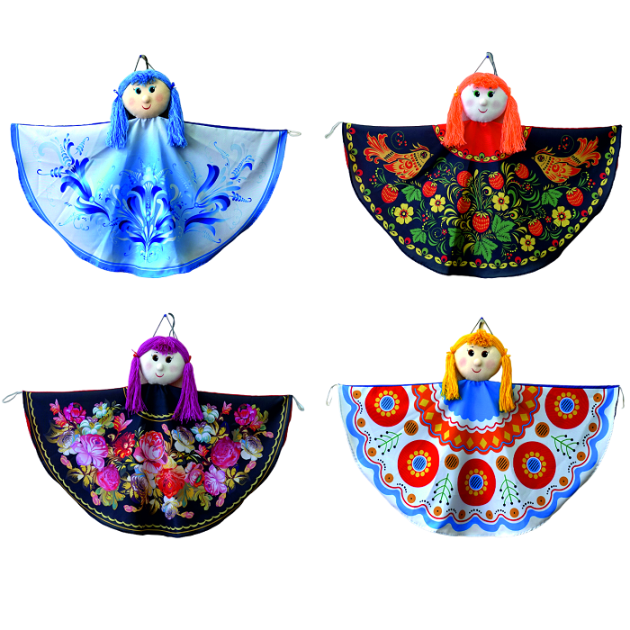 В набор входят платковые куклы с изображениями народных художественных промыслов: гжель, дымковская роспись, жестовская роспись, хохломская роспись
