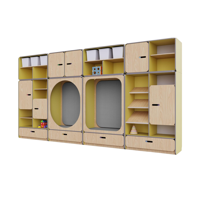 • Корпус изготовлен из экологичной березовой фанеры и ламинированной плиты. Эти материалы устойчивы к механическим воздействиям и влаге, что обеспечивает долговечность и безопасность их использования в детских учреждениях.