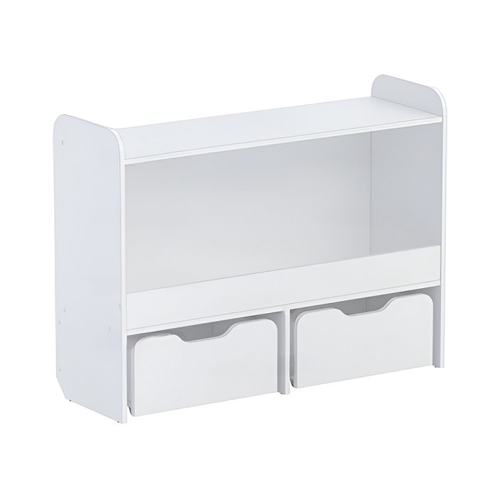 Стеллаж состоит из жестко скрепленной полками тумбы и двумя выдвижными ящиками.