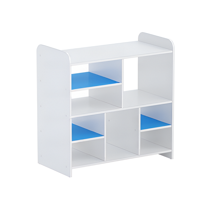 Конструкция стеллажа не имеет острых граней и углов. Тумба стеллажа установлена на пластиковые подпятники.
