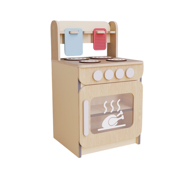 Плита и духовой шкаф изготовлены из натурального дерева, что делает их прочными и безопасными для детей. Компактный дизайн и реалистичные детали создают увлекательную игровую среду, где маленькие шеф-повара смогут готовить свои кулинарные шедевры.