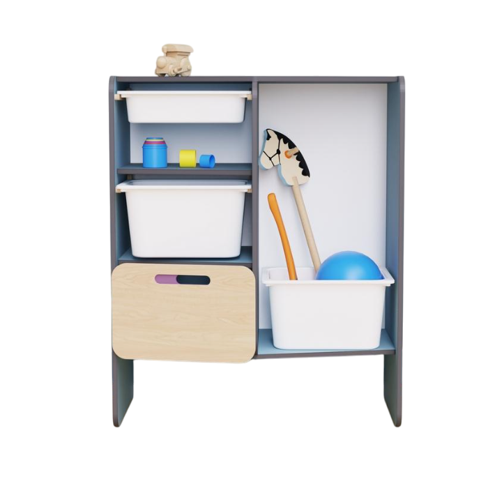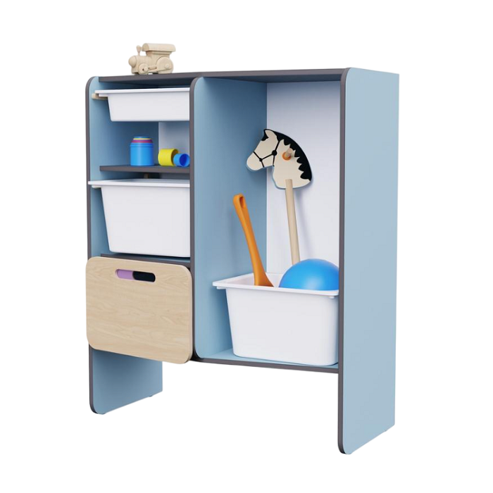 Модуль дополнительно оснащён ящиком полного выдвижения, что упрощает доступ к инвентарю. Снизу предусмотрено место для выдвижной скамейки. Шкаф изготовлен из экологичной берёзовой фанеры с безопасными скруглёнными краями. Три пластиковых контейнера полностью вынимаются и дезинфицируются.