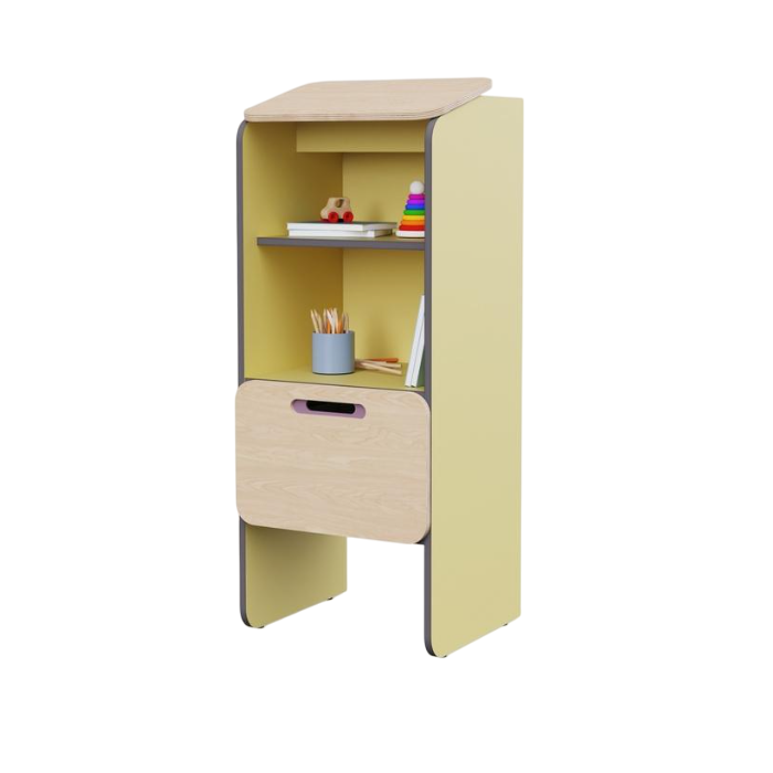 Шкаф-конторка для записей с наклонной верхней столешницей служит для ведения журналов приёма и передачи детей, а также заполнения необходимых документов. Конструкция эргономична для анатомии взрослого человека, и воспитателю будет удобно делать записи. Предмет из коллекции мебели «НЕГА».