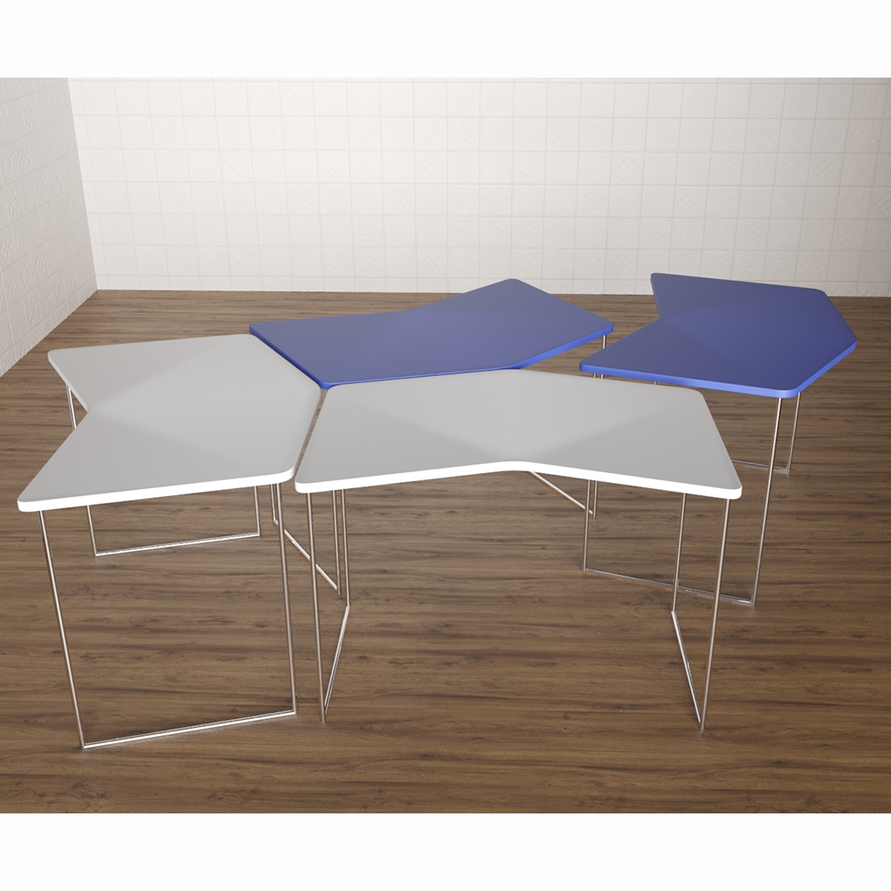 Стол имеет легкую и простую конструкцию, состоит из 4-х отдельных столиков белого и голубого цветов, которые могут использоваться по отдельности, а при необходимости – сдвигаться в единую конструкцию. Детский стол “Стрелочки” нужен для оснащения учебными местами групп в ДОУ, коррекционных и развивающих центрах.