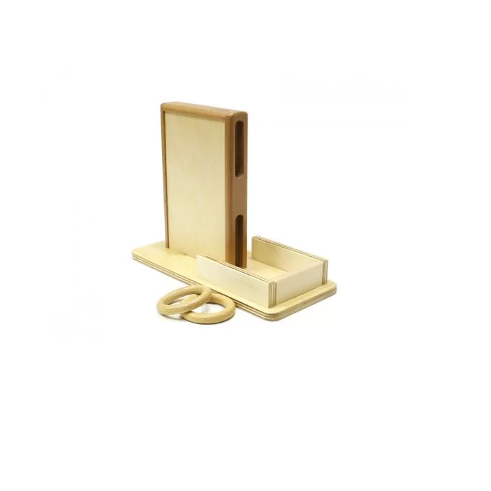 Ребенок отпускает деревянное колечко в верхнюю прорезь и наблюдает, как оно выкатывается из нижней прорези. Радуется и повторяет снова.