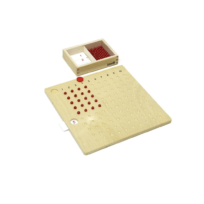 Доска предназначена для упражнений в умножении чисел от «одиножды один» до «десятью десять». С помощью простых наглядных материалов ребёнок многократно повторяет умножение одного и того же числа на разные множители от 1 до 10, запоминая тем самым таблицу умножения. Выложенные на доске бусины наглядно демонстрируют геометрическую интерпретацию произведения 2-х чисел, как прямоугольника.