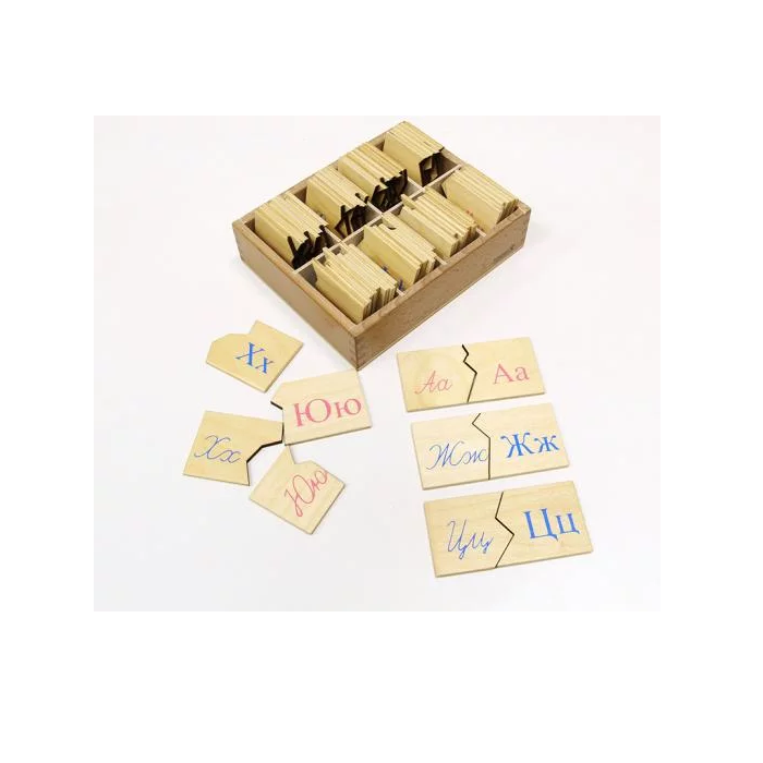 В деревянной коробочке с отделениями находятся 33  таблички с письменными буквами русского алфавита и соответствующие им 33 таблички с печатными буквами. По 2 буквы на каждой табличке: заглавная и строчная. Все    таблички выполнены в виде пазлов.