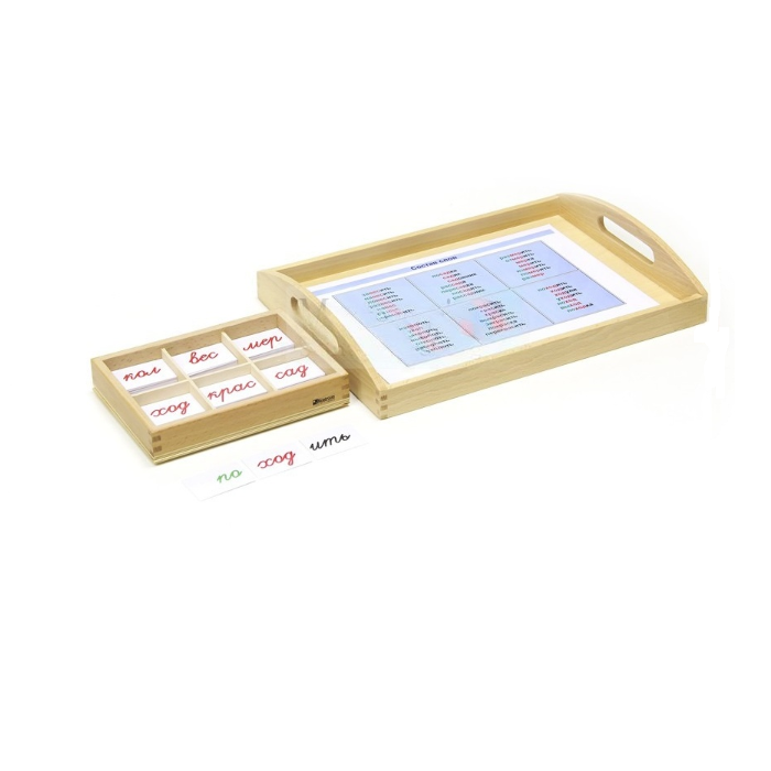 На маленьких карточках написаны части слова: красными чернилами корень слова, зелёным префикс (приставки) и чёрными постфикс (суффикс с окончанием). Ребёнок выкладывает несколько карточек с одинаковым корнем, потом добавляет к ним постфиксы, получая новые слова, а затем получает ещё новые слова, добавляя приставки. И вот, перед ним группа однокоренных (родственных) слов.